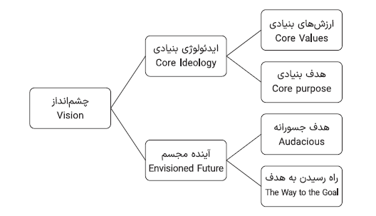 چشماندازی که به خوبی پرورانده شده باشد از دو جزء اصلی تشکیل شده است: ایدئولوژی پایه (Core Ideology) و آینده تصویرشده (Envisioned Future). ایدئولوژی پایه (یین)، که یکی از دو قطب متضاد طرح را تشکیل میدهد، که چرایی و چگونگی شرکت را نشان میدهد. «یین» تغییر ناپذیر است و «یانگ» یا همان آینده تصویرشده را تکمیل میکند. آینده مجسم، مستلزم تغییر قابل توجه و پیشرفت است و نشاندهنده آنچه که شرکت مشتاق است به آن تبدیل شود. ایدئولوژی پایه: خصلت پایدار سازمان را تعریف میکند. هویتی منسجم که از چرخههای عمر محصول یا بازار، موقعیتهای تکنولوژیک، مدهای مدیریتی و رهبران مجزا فراتر میرود. هویتی که از مسیر مهمتر است، زیرا مقصد شما با تغییر دنیای پیرامون شما تغییر خواهد کرد. رهبران میمیرند، محصولات کهنه میشوند، بازارها تغییر میکنند، تکنولوژیهای تازهای پدیدار میشوند و مدهای مدیریتی میآیند و میروند، اما ایدئولوژی پایه یک شرکت بزرگ به عنوان منبع هدایت و الهام همواره پابرجا میماند. به وجود نمیآید، کشف میشود. با نگاه به درون سازمان آن را درک میکنید نه محیط بیرونی آن. ایدئولوژی پایه قرار نیست تمایز ایجاد کند یا به سمت شایستگیمحوری برود، بلکه همچون چسبی عمل میکند که سازمانی را که رشد میکند، متنوع میشود، در سطح جهان گسترش مییابد و به توسعه تنوع در محل کار اقدام میکند، یکپارچه میدارد. هر چشمانداز اثربخشی باید تجسمکننده بخش ایدئولوژی پایه سازمان باشد که به نوبه خود شامل دو بخش متمایز است: ارزشهای محوری، نظامی از اصول و عقاید راهنما؛ و هدف اصلی، بنیادیترین دلیل وجودی سازمان. ارزشهای محوری (Core Value)، مرامهای اصلی و پایدار هستند و برای افراد سازمان ارزش و اهمیت درونی دارند. مانند دو ارزش محوری تخیل و ارتقاء سلامت روح و روان، در کمپالی والت دیزنی. ارزشهای محوری از نیازهای بازار به دست نیامده، بلکه از باور ذاتی بنیانگذار شرکت برآمدهاند. برای مثال سونی خدمات مشتری، دیزنی احترام به فرد، فروشگاههای وال-مارت کیفیت و اچپی تاکید بر بازار را ارزش محوری خود قرار دادند. شرکتها معمولا تعداد محدودی ارزش محوری، بین سه تا پنج ارزش دارند. چراکه تنها تعداد معدودی ارزش واقعا میتواند محوری باشد، یعنی به قدری بنیادی و ریشهدار باشند که یا اصلا تغییر نکنند یا به ندرت تغییر کنند. افرادی که باید درتبیین ارزشهای محوری شرکت کنند، با بزرگی، عمر و پراکندگی جغرافیایی شرکت تغییر میکنند. حتی سازمانهای جهانی که از مردمی با فرهنگهای بسیار متفاوت تشکیل شدهاند، میتوانند مجموعه ارزشهای محوری مشترکی را شناسایی کنند. - هدف بنیادی (Core Purpose)، دومین جزء ایدئولوژی پایه و دلیل وجود سازمان است. یک هدف اثربخش، بیانگر انگیزشهای آرمانگرایانه افراد برای انجام دادن کار شرکت است که بیان آن صرفا بر مبنای خروجی سازمان یا مشتری نیست، بلکه گویای روح سازمان است. هدفی که ورای پول درآوردن، به دلایل عمیق هستی سازمان میپردازد؛ مانند ساختن یک محصول، ارائه یک خدمت و به طور کلی انجام یک کار با ارزش. هدفی که دستکم باید 100 سال دوام داشته باشد و تغییر نمیکند اما الهامبخش تغییر است. ستاره قطبی که راهنمای همیشگی است اما نمیتوان به آن رسید. واقعیت این نرسیدن بدین معناست که سازمان هرگز نمیتواند دست از تغییر و پیشرفت بردارد. به عنوان مثال هدف مکینزی اند کمپانی انجام دادن مشاورههای مدیریت نیست، بلکه کمک به بنگاهها و دولتها برای کسب موفقیت بیشتر است، و یا هدف هیولت-پاکارد، ساخت تجهیزات آزمایشی و اندازهگیری الکترونیکی نیست، بلکه ارائه دستاوردهای فنی برای بهتر کردن زندگی مردم است. یکی از روشهای نیرومند مشخص کردن هدف وجودی بنگاه، استفاده از «پنج چرا» است. بدین ترتیب که کار را با گزاره توصیفی «چرا محصولات ایکس تولید میشود» یا «خدمات ایکس ارائه میشود»، شروع شده و سپس به «چرا آن کار مهم است» میرسد. با تکرار این چرا در هر مرحله بیشتر به پاسخ نزدیک میشوید. آینده مجسم، دومین عنصر اصلی چارچوب چشمانداز و 